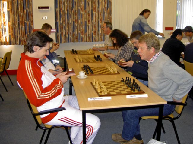In de A-groep behaalde Wageningen met nog een ronde te spelen definitief de eerste plaats. Toch moest het evenals vanmorgen 1 punt aan De Cirkel laten. BSV1 verpletterde ESV. Wim stelde met een mooie combinatie het eerste punt veilig en gaat voor de beste score bij BSV. Alleen Martijn kan hem nog bijhalen.Deze won regelmatig van Bas West. Harry gaf zijn dame voor een toren en een paard. Toen hij een tweede toren in de aanbieding kreeg wist hij de winst binnen te halen. Jan speelde remise. Voor de Cirkel2 was de wraak zoet tegen het tweede van Bennekom. Na in de ochtend te hebben verloren wisten de Edenaren nu met omgekeerde cijfers te winnen. Alleen Bakker won, terwijl Rini tevreden moest zijn met remise.
